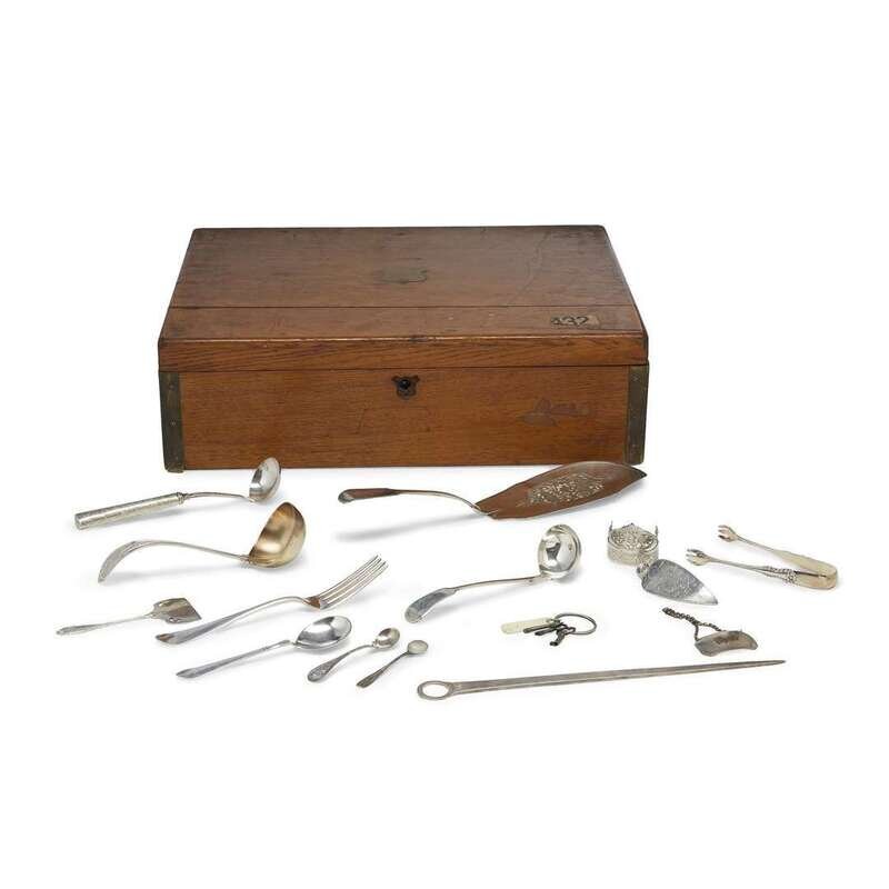 comprising a fish fork, a stuffing spoon, a skewer, tablespoons, dinner forks, ladles, salt spoons, a butter knife, a food pusher, a decanter label, tongs, napkin rings, and a small vinaigrette.