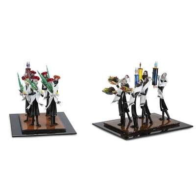H: 9, W: 9, D: 12 (each sculpture), H: 14, W: 9 1/2, D: 12 1/2 in. (display case)