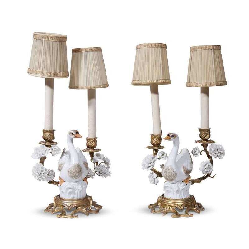 A pair of Mottahedeh giltmetal mounted porcelain swan-form two-light lamps mid 20th century