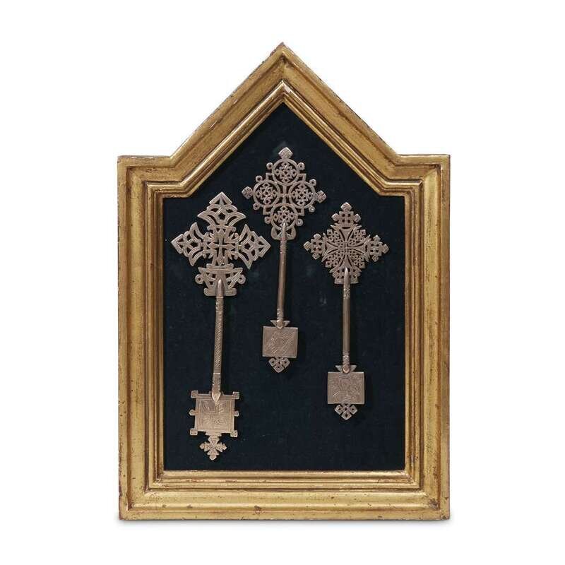 A framed group of three wrought-metal Coptic crosses ethiopia, 19th/20th centuries