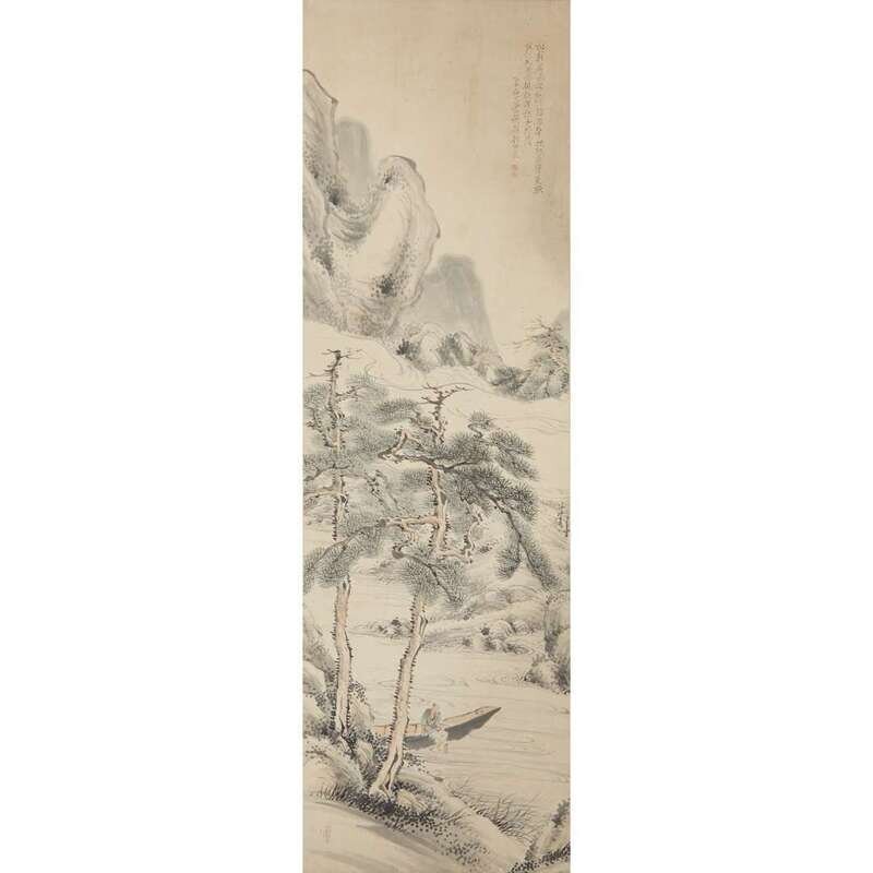 TANIMURA CHIKUDEN LATE 18TH/EARLY 19TH CENTURY A GENTLEMAN IN A BOAT ALONG A RIVER, UNDER GNARLED PINES, IN THE MOUNTAINS
