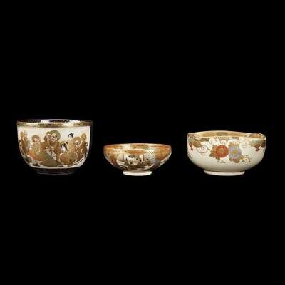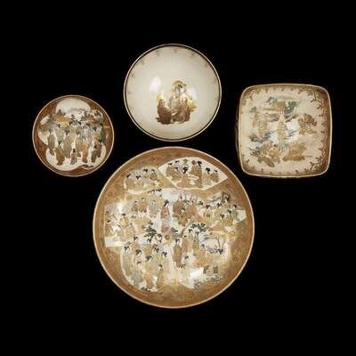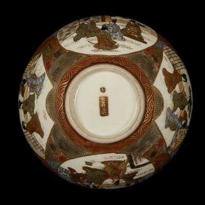 The bowls including a squared example decorated with samuri, the other pieces with various figures. All signed on underside.