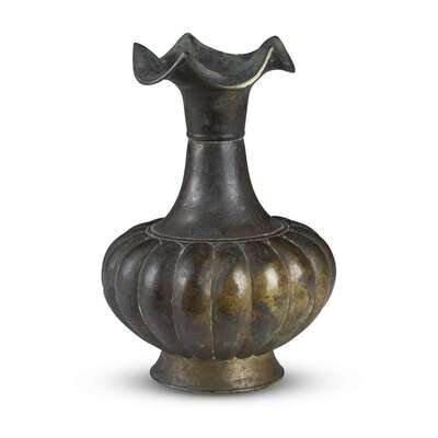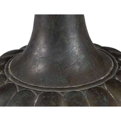A patinated and incised bronze lobed vase with crimped and flared lip, possibly Korean