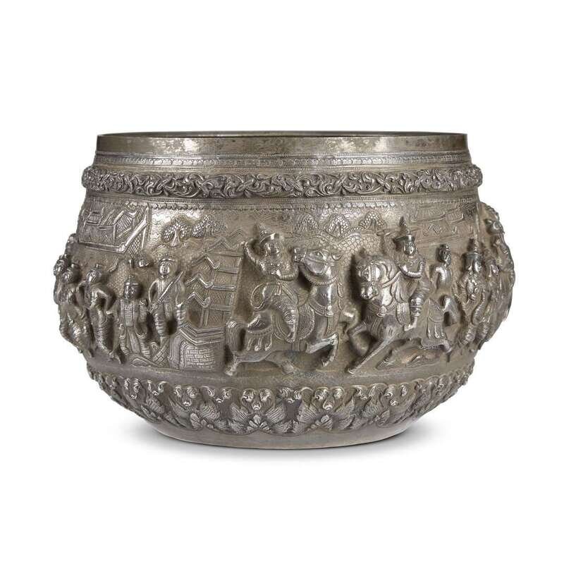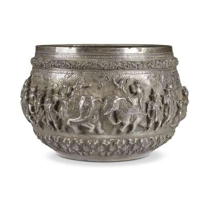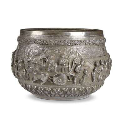 A large Burmese silver repousse figural bowl 19th/early 20th century