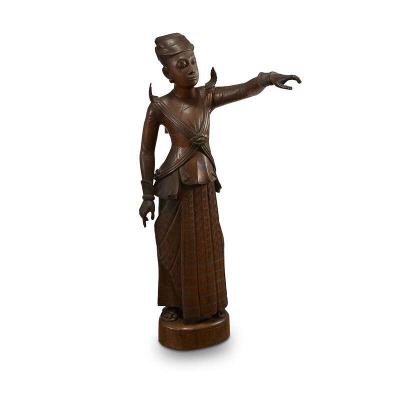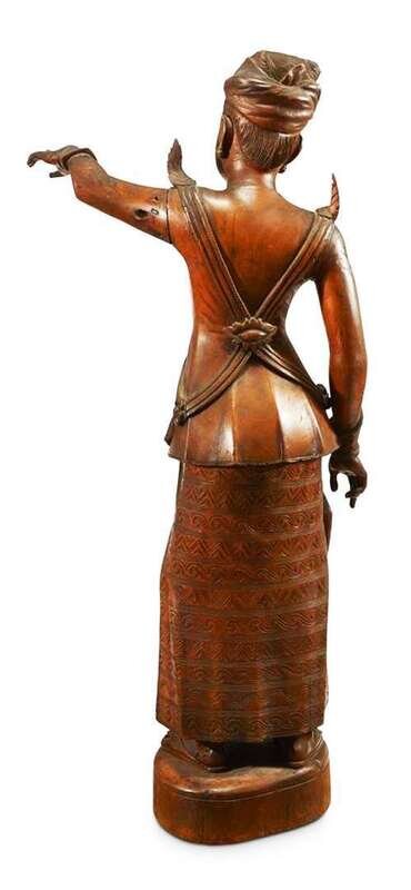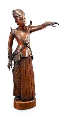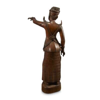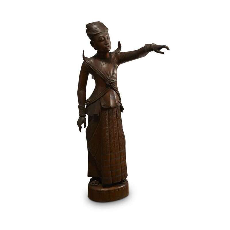 A Burmese carved wood figure of a standing man, pointing in the distance
