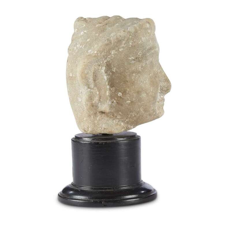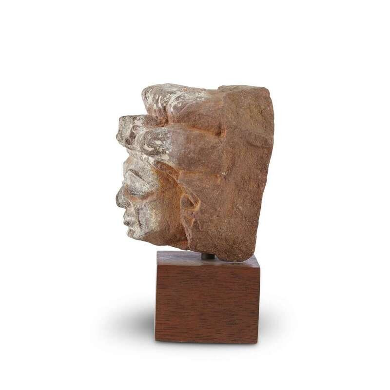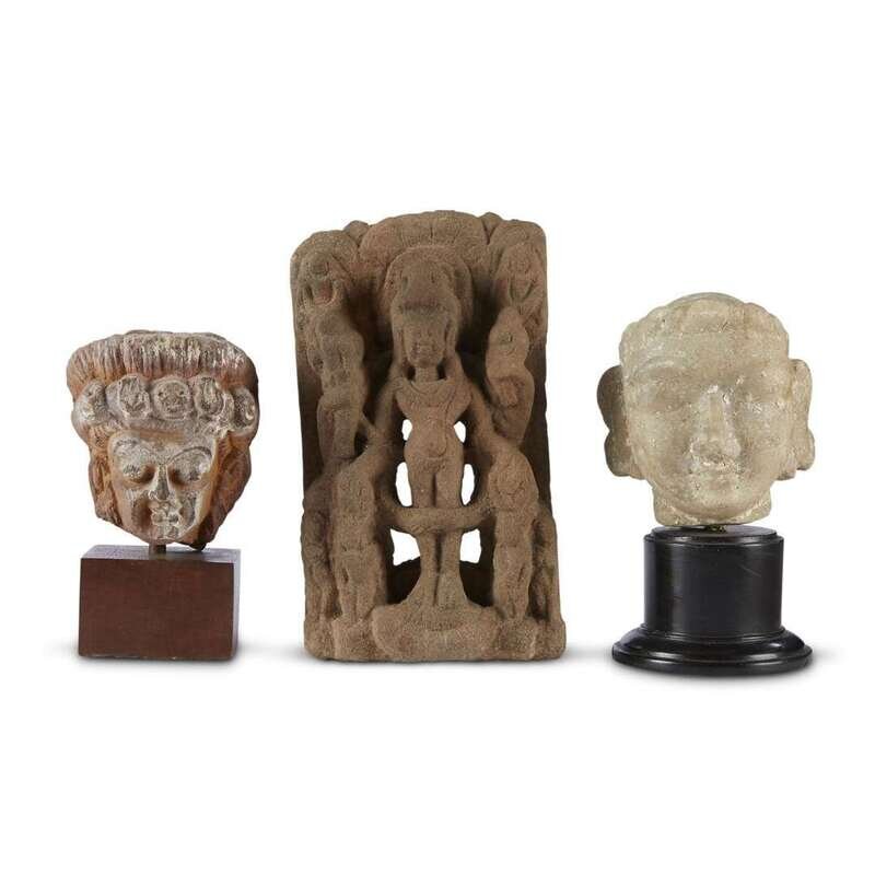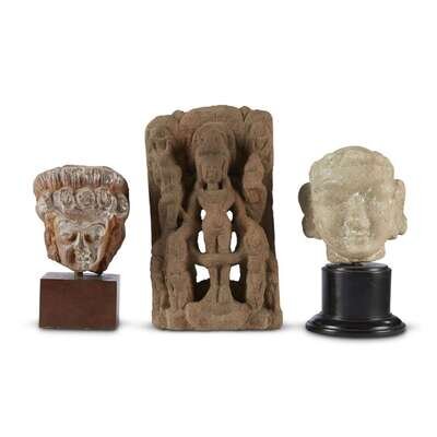 Comprising a carved white marble head of a man, possibly Rajasthan; a small carved sandstone stele, depicting Vishnu; and a Mathura-style carved pink sandstone head.