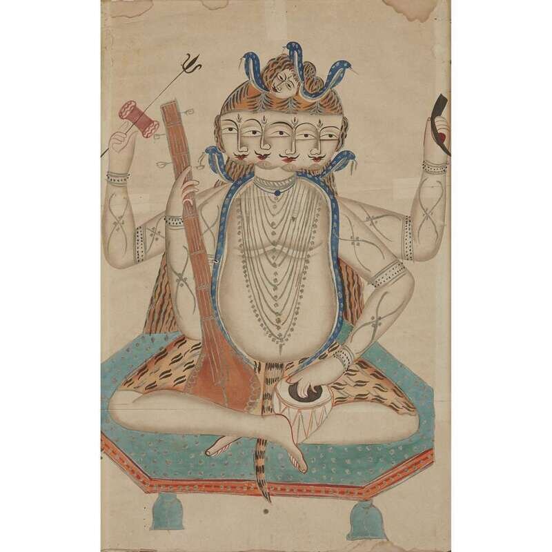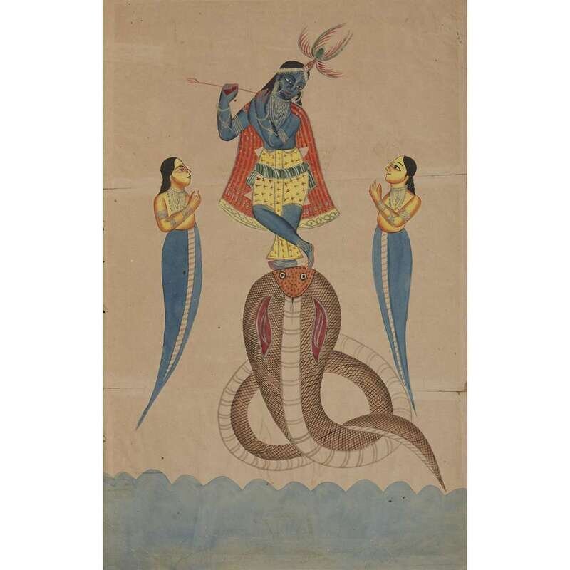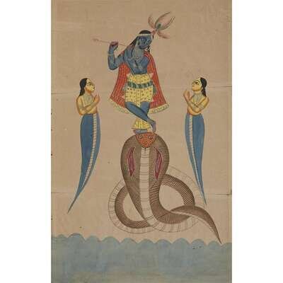 Opaque watercolor on paper The first depicting Krishna playing a flute atop a cobra, adored by two naga maidens; the second a multiheaded, multi-armed deity, possibly Shiva, unframed.