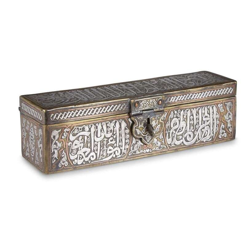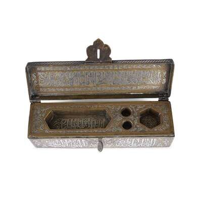 A Mamluk revival silver and copper-inlaid rectangular brass kalamdan