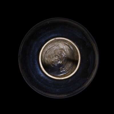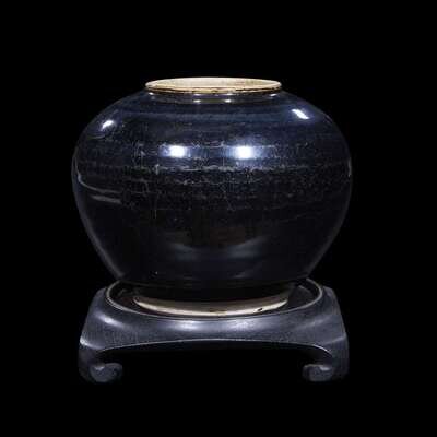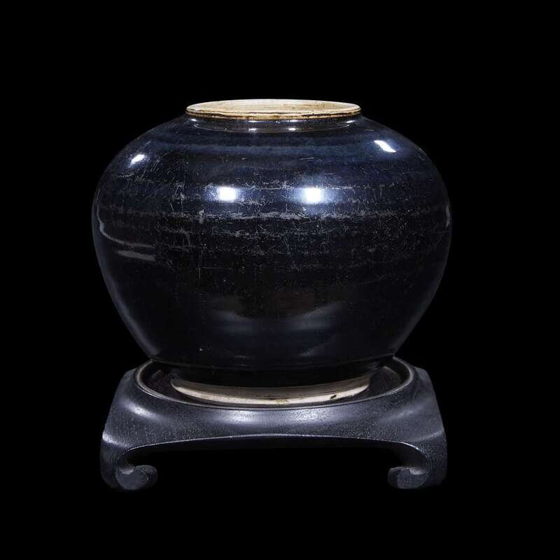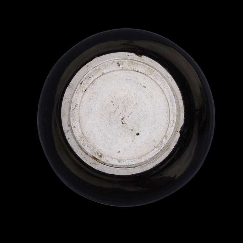 Of slightly compressed globular form, the thick black glaze stopping above the buff foot. The lip is unglazed.
