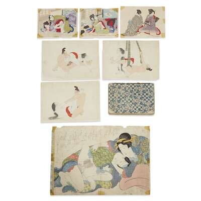 Comprising four prints; three paintings, ink and color on silk; and one small woodblock "pillow book".