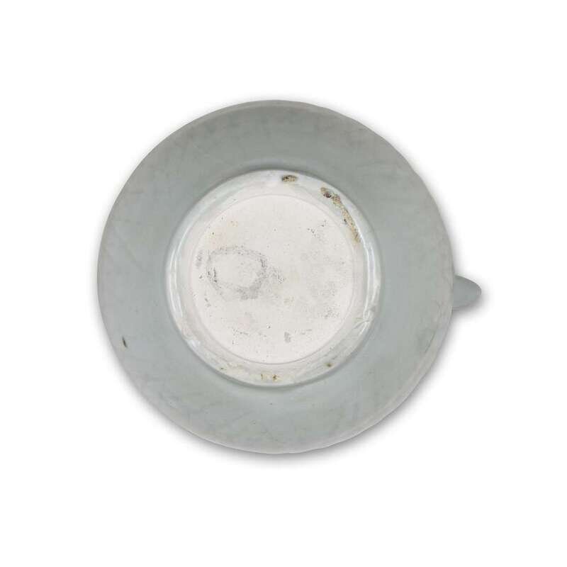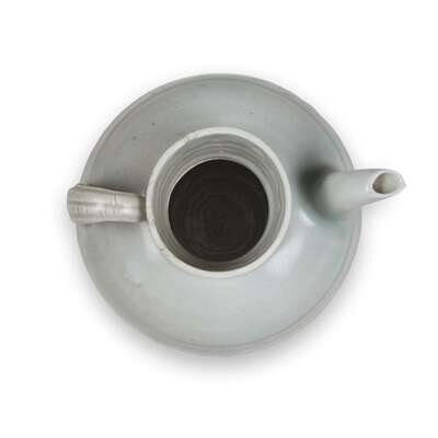 The globular body with stylized "fishnet" pattern, the nearly straight neck with ridged looped handle, opposite a short curved spout, the glaze with a faint blue tint.