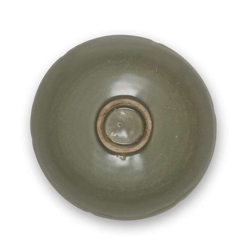 Of rounded six-petaled form, each panel incised with lotus blossoms or scrolls, the well with a molded five-petaled flower, olive-green glaze.