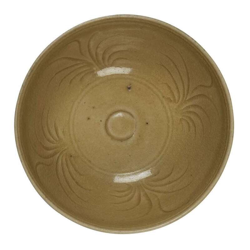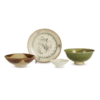 Comprising a Changsha bowl, Tang Dynasty, decorated with stylized scrollwork; a small Chinese white ware floriform small bowl, probably Song Dynasty; a cream and grey-blue decorated circular dish, probably south Chinese; a Vietnamese green-glazed floriform bowl, 14th century; a Vietnamese olive-yellow glaze bowl 14th/15th century.