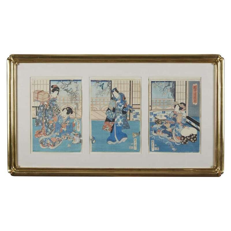 Color woodblock triptych, framed, matted and glazed. frame overall H., 24 1/4 in., 61.5cm; W: 42 1/2 in., 108cm