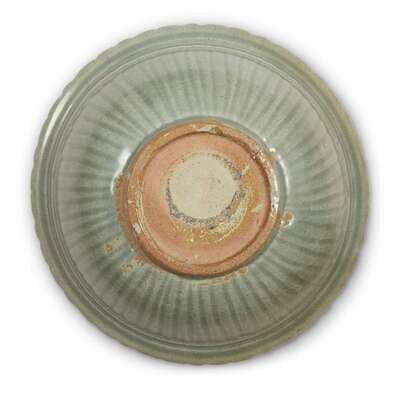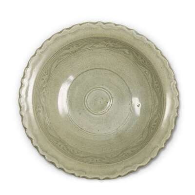 The interior of the Vietnamese bowl incised with scrolling foliage, the exterior with stylized lotus petals; the Thai dish, 14th-16th century, with scalloped rim, incised meander border, the Thai bowl of similar date, with similar border.