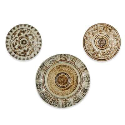 Variously decorated with stylized vegetation, the two smaller jars with incised scrollwork.