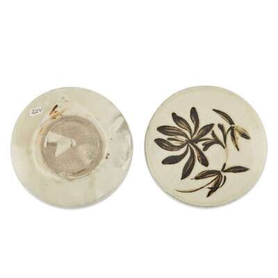 Decorated with a stylized lotus-spray in iron-brown against a creamy slip ground.