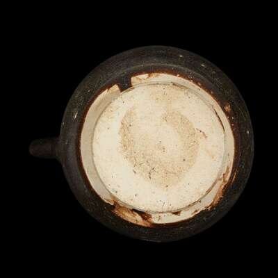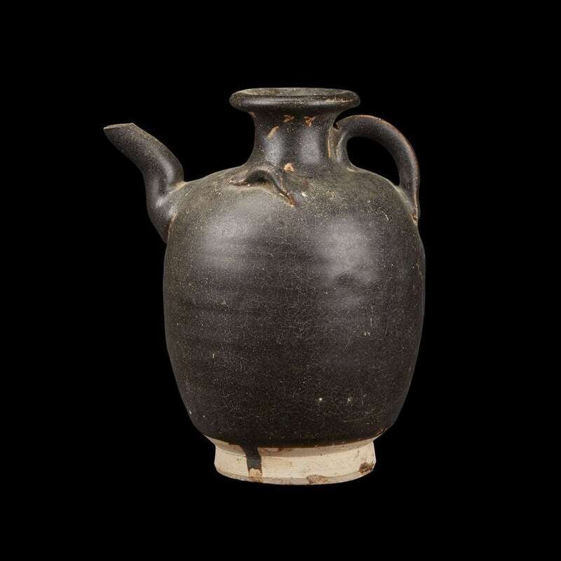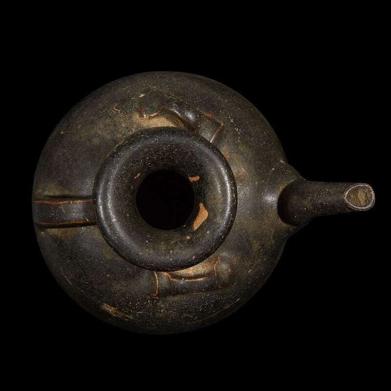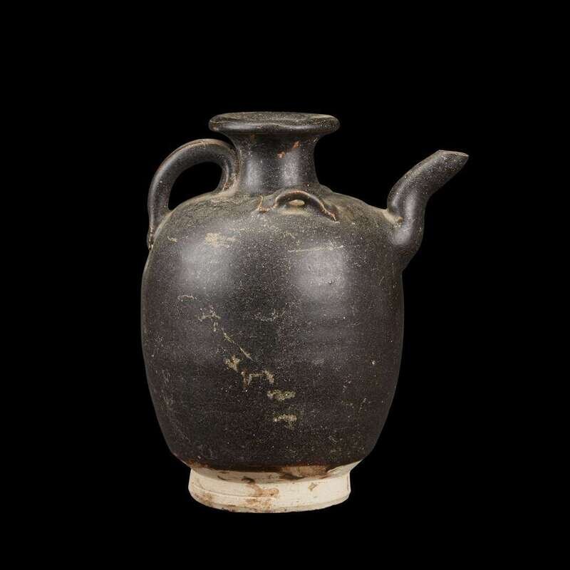 The ovoid body with short neck, flared rim, a short spout opposite a loop handle, two lugs at the shoulder, a matte dark brown-black glaze.