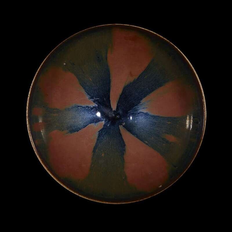 The hemispherical bowl with five russet splashes against a black glaze.