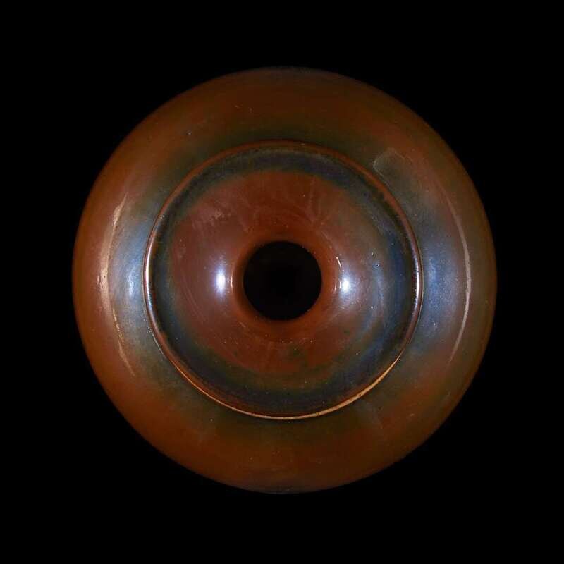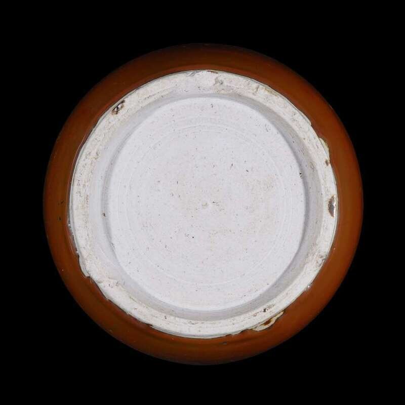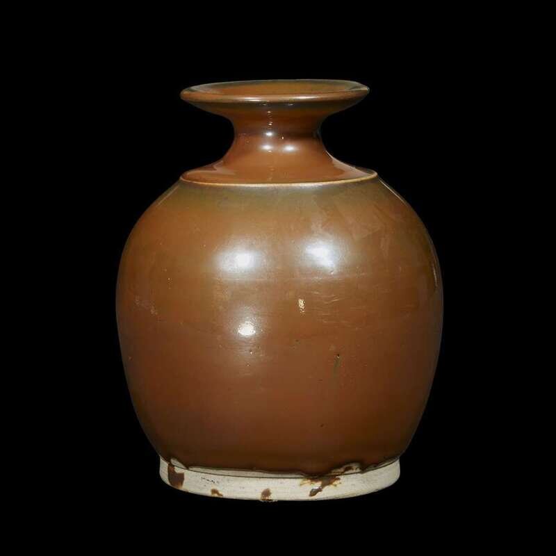 Ovoid with pinched neck and flared lip, a glossy persimmon-brown glaze.