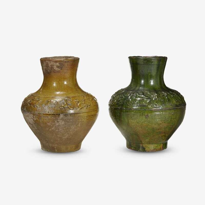 A Chinese yellow glazed and a green glazed pottery wine jar, Hu western han dynasty