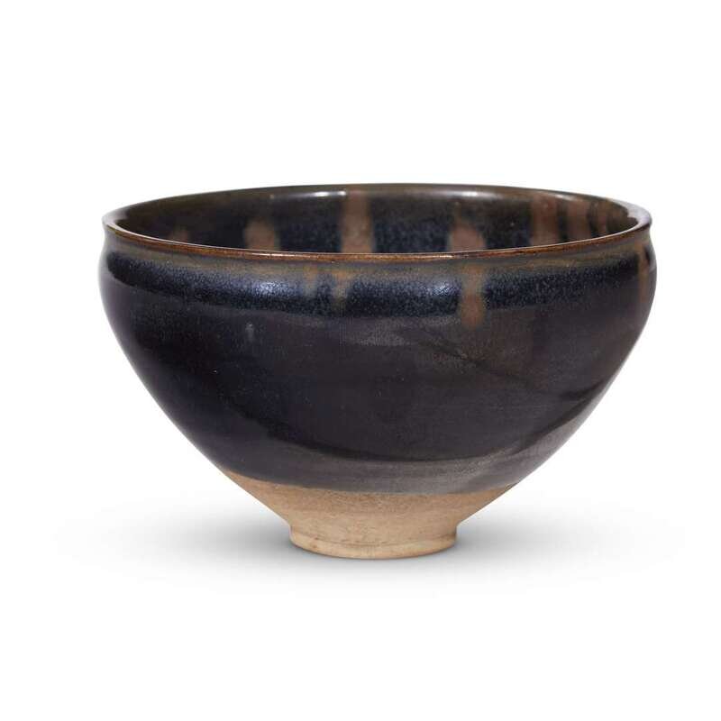 formed with sturdy sides over a small foot, decorated with light brown spots over dark glaze to interior and exterior walls.