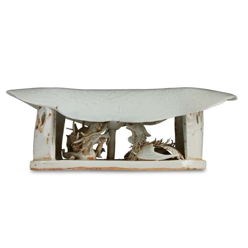 The curved top incised with a dragon, with modeled dragon and phoenix under the "saddle"-form top, the glaze with a pale-blue tint.