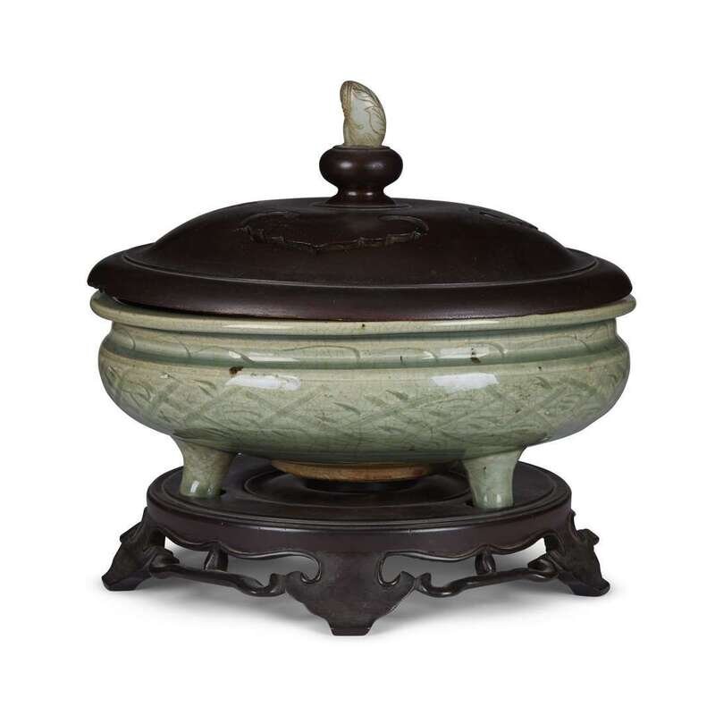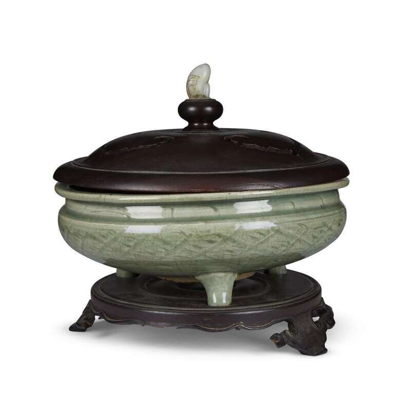 A Chinese Lonquan celadon censer with carved wood cover and stand, carved grey-white finial the censer ming dynasty