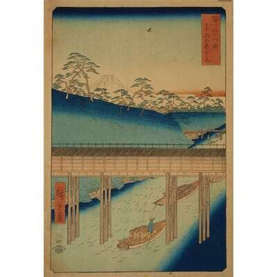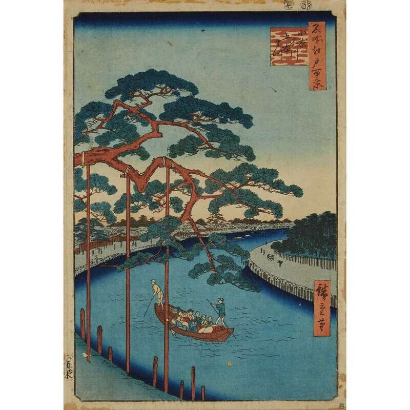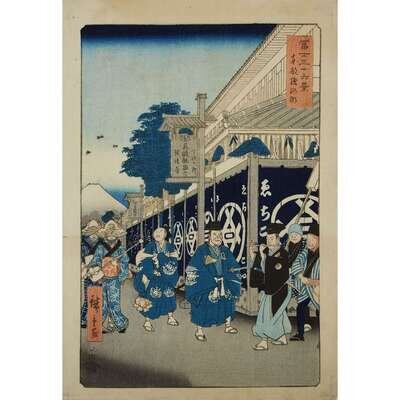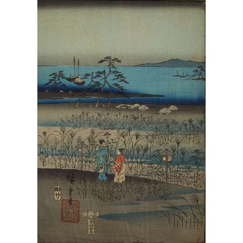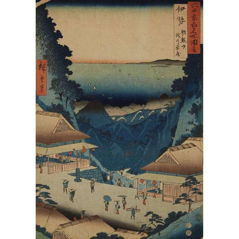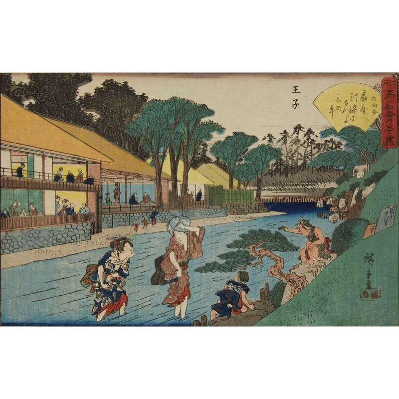 Toto Suruga-cho, from the series of Fuji Sanju Rokkei, 1858; Tota Ocha-no-mizu, from the series of Fuji Sanju Rokkei, 1858; Oji, Ogiya, from the series of Edo Komei Kaitei Zukushi, circa 1838-40; Onagigawa Gohonmatsu, from the series Meisho Edo Hyakkei, 1856; Ise Asama-yama toge no chaya, Rokuju-yo Shu Meisho Zue, 1853. all L approximately: 13 in., 33 cm; W: 8 3/4 in., 22.2cm A scene from the triptych of Furyu Genji: Akashi, 1853. L: 14 1/2 in., 37.4 cm; W: 9 3/4 in., 25 cm Unframed