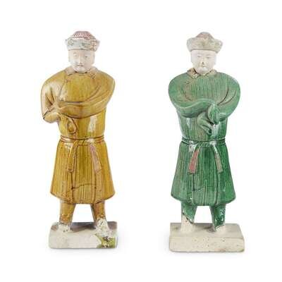 Two painted and glazed pottery figures of standing attendants ming dynasty