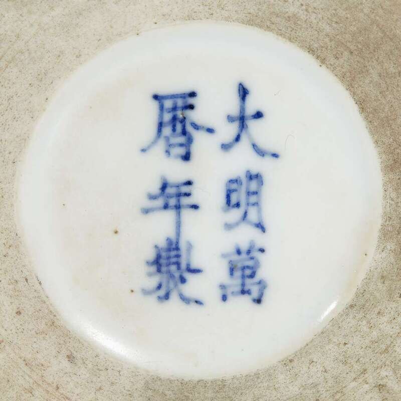 painted on the exterior with scene shows ladies with fans, a mandarin bearing gifts, cloud bands and wall.