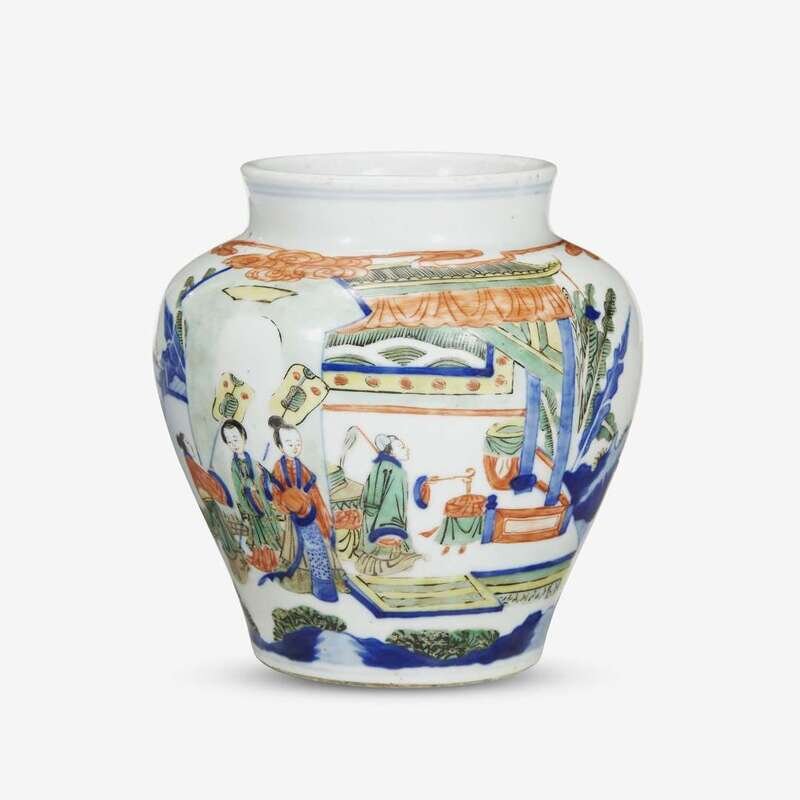 A small Chinese wucai-decorated porcelain "Court scene" jar wanli six character mark