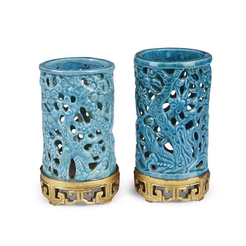 A matched pair of turquoise-glazed pierced cylindrical small brush pots, with later gilt wood stands