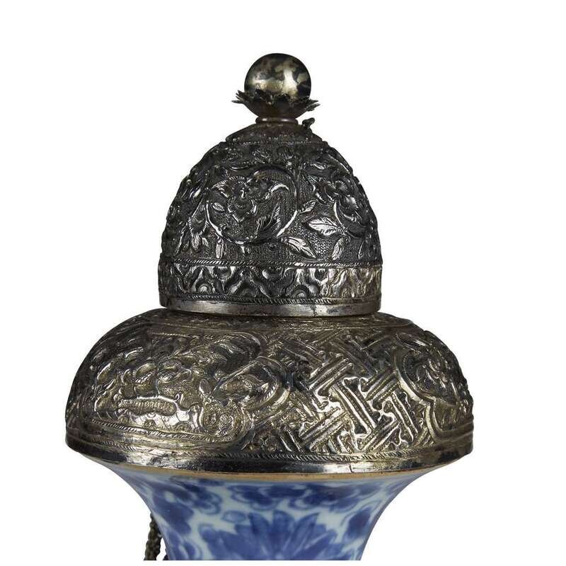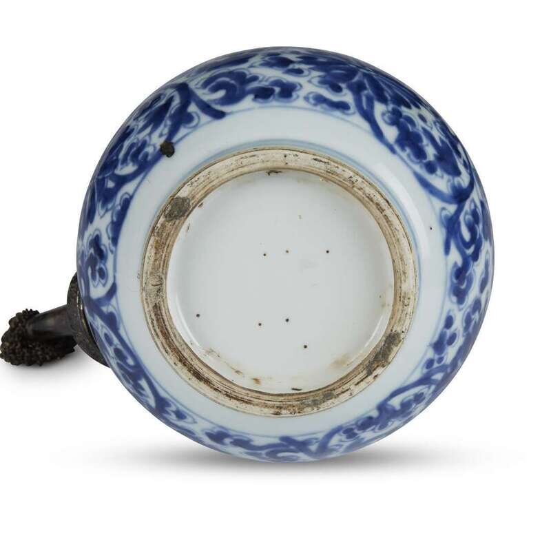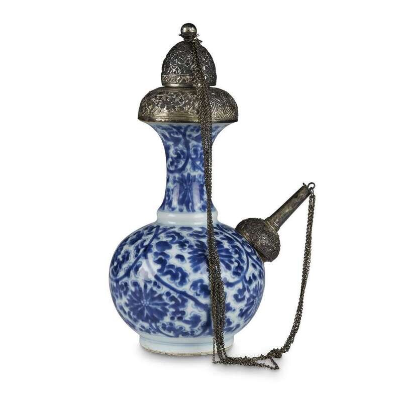A Chinese silver-mounted blue and white porcelain kendi the porcelain, kangxi period, the silver mounts possibly contemporary