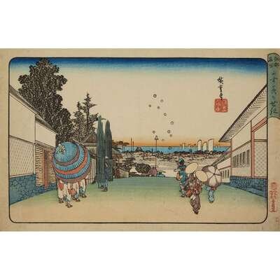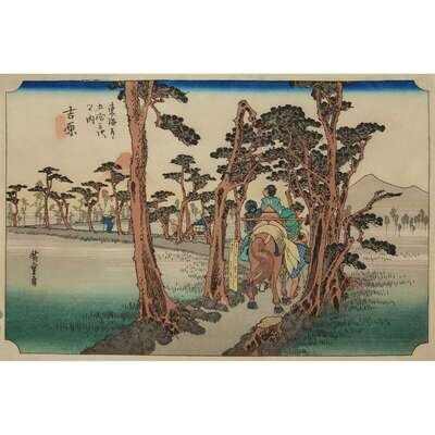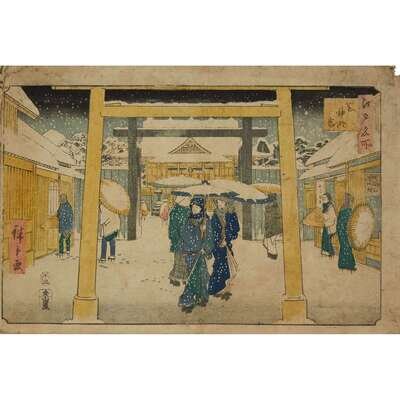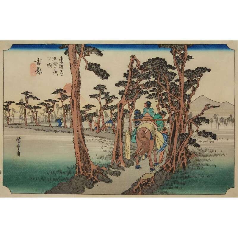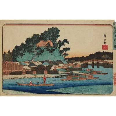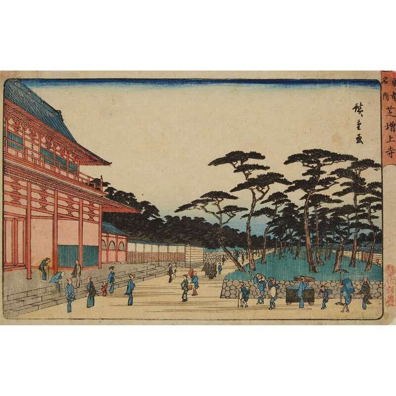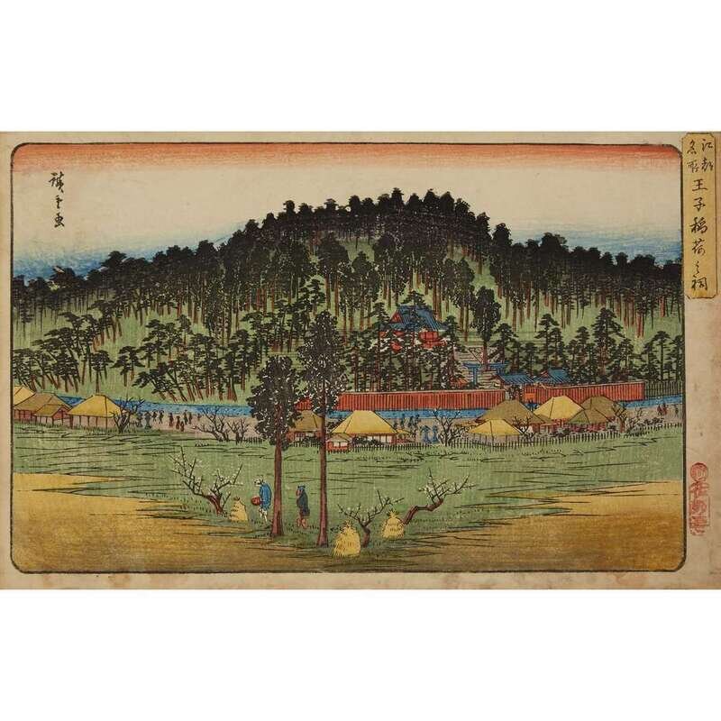 Matsuchiyama no zu, from the series Toto Meisho, circa 1832-38; Oji Inari no Hokora, from the series Koto Meisho, circa 1839-1842; Shiba Zojo-ji, from the series of Toto Meisho, circa 1835-44; Yoshiwara, Hidari Fuji, from the series Tokaido Gojusan Tsugi no Uchi; Kasumigaseki, from the series Koto Meisho, circa 1832-34; Shiba Shin Meigu, from the series Edo Meisho, 1858. L: 13 3/4 in., 35cm; W: 8 3/4 in. 22.2cm, unframed