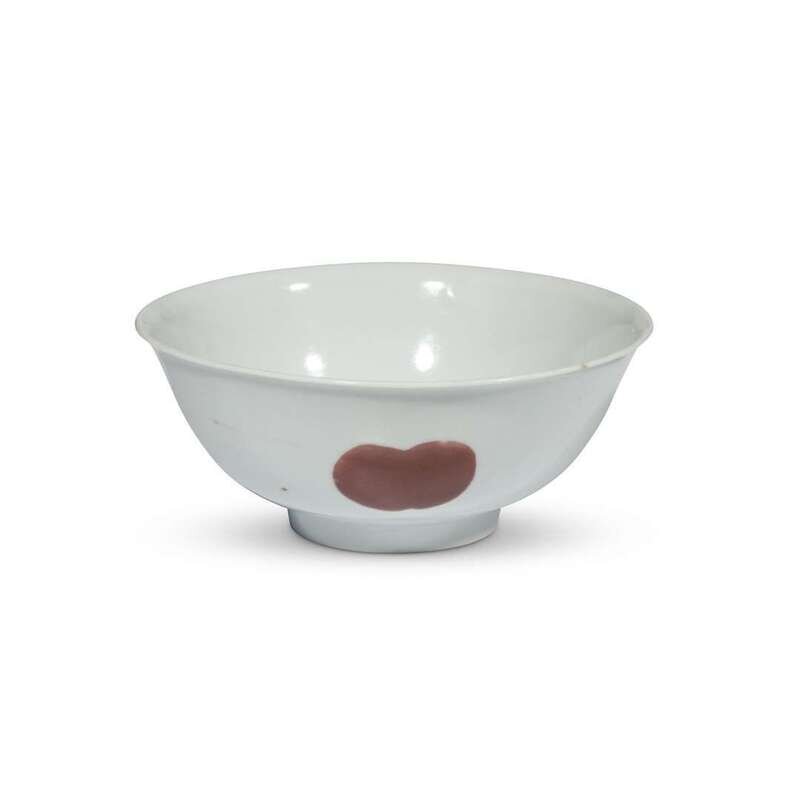 with deep rounded sides rising to a flared rim, the exterior decorated in copper-red with pomegranate, lychee, and peach, Sanduo (three abundances).