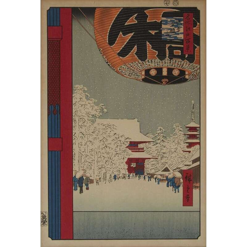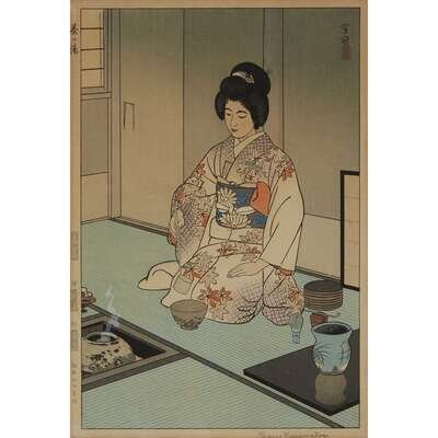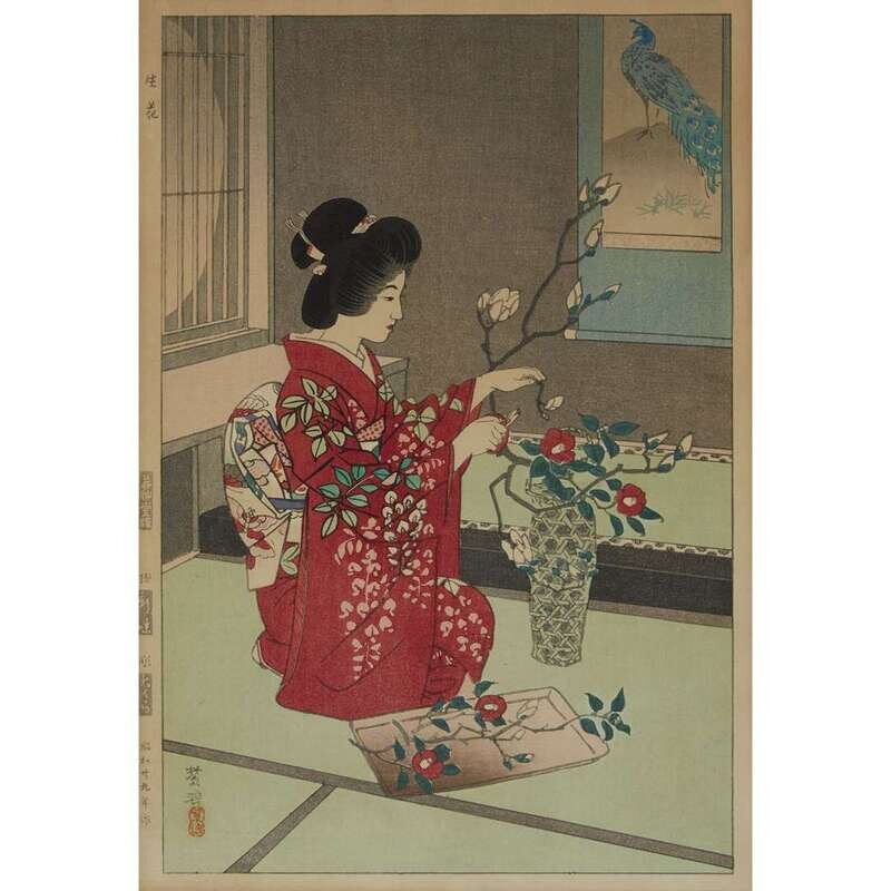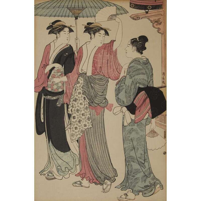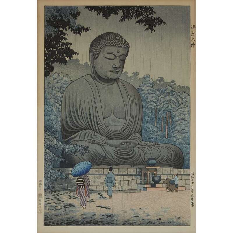 Comprising: After Hiroshige, "Asakusa Kinryuzan"; after Torii Kiyonaga, "Two Ladies and a Servant out Walking"; Asano Takeji, "Kamakura Great Buddha"; Kasamatsu Shiro, "Chanoyu" and "Ikebana"; all framed, matted and glazed.