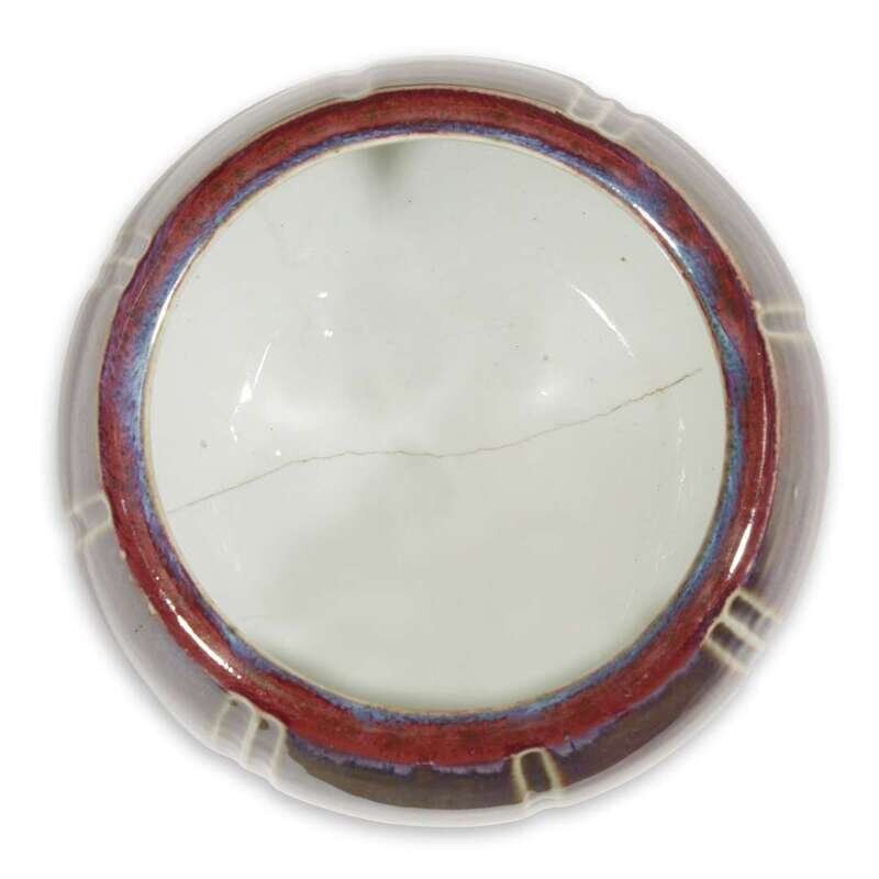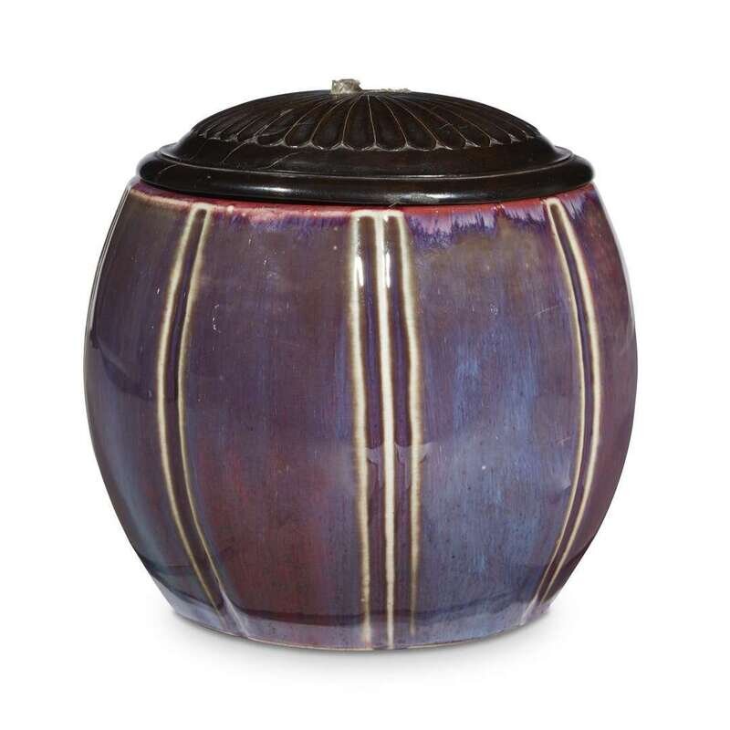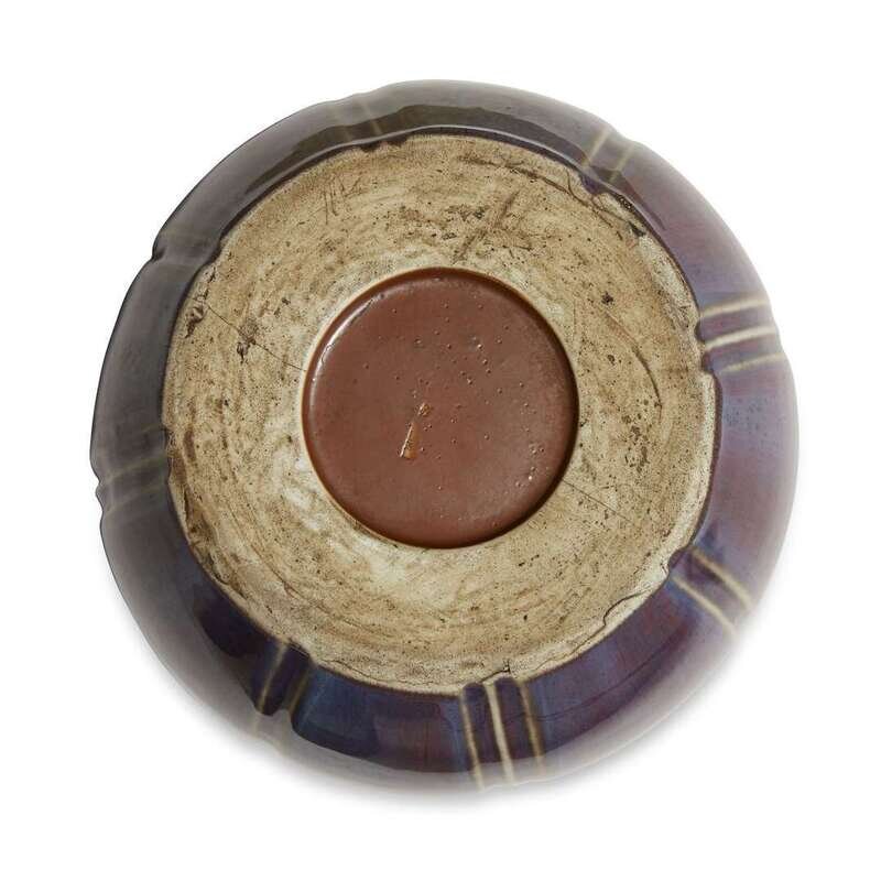 The exterior with a blue-purple glaze. The cover carved with radiating flutes, the underside with recessed brown-glazed circular center.