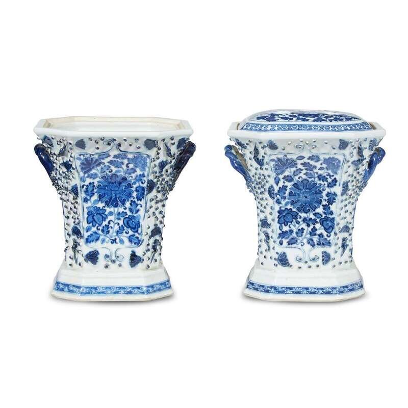A pair of Chinese export porcelain blue and white-decorated bough pots with one cover late 18th/early 19th century