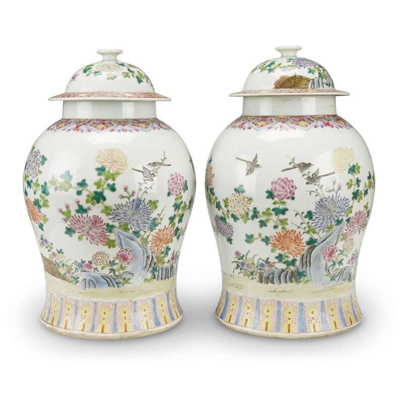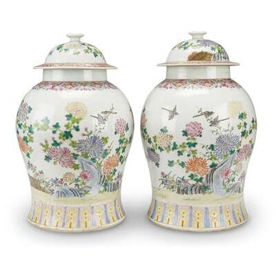 Pair of Chinese famille rose-decorated porcelain covered jars