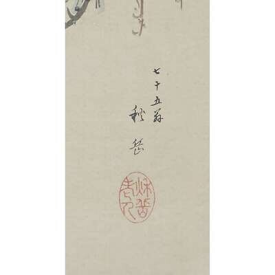 Ink and color on silk, signed Shugaku (at age 75), and with one seal, in a brocade mount, framed and glazed. sight H: 40 in., 101.6cm; W: 16 1/2 in., 41.9cm