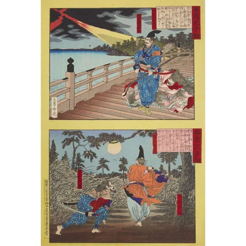Comprising a group of ten woodblock sheets with two narrative scenes each; three woodblock triptychs (two by Toyohara Chikanobu); two single sheet woodblocks by Chikanobu, four hand-colored prints, unframed.
