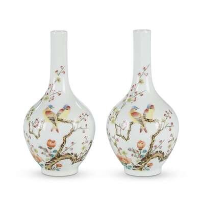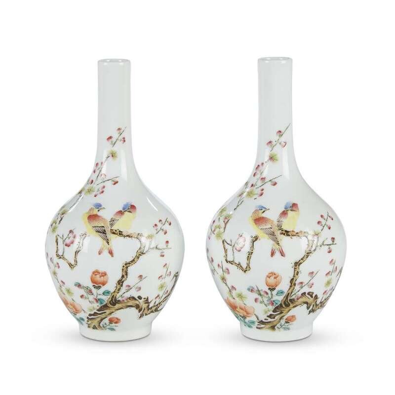 A pair of Chinese famille rose-decorated "Birds and Prunus" small bottle vases, Qianlong marks but later