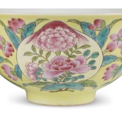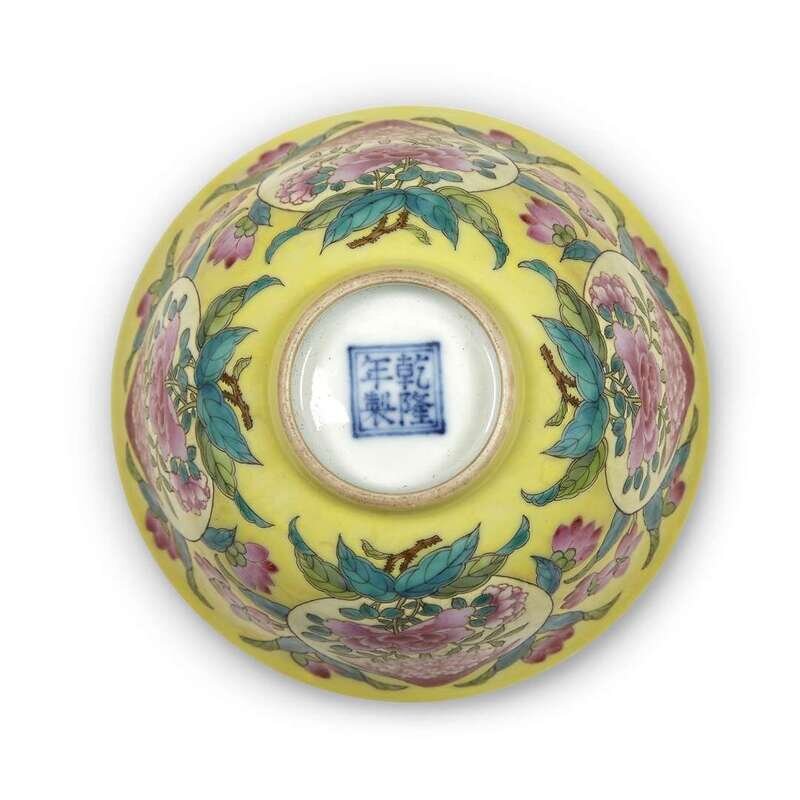 Pair of finely decorated Chinese famille rose-decorated yellow-ground porcelain small bowls qianlong four-character mark but later