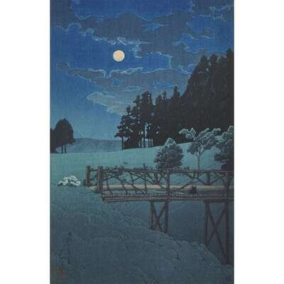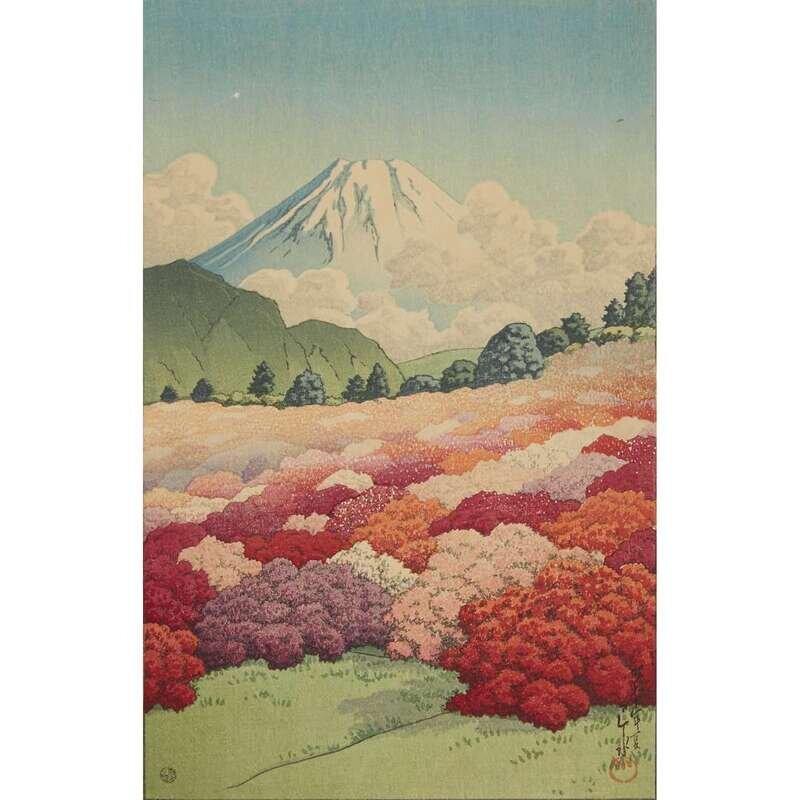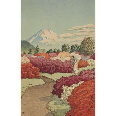 Comprising: Akebibashi no yoru "Moon over Akebi Bridge", Tsutsuji niwa yori Fuji o miru "View of an azalea garden and Mount Fuji", Tsutuji niwa ni asobu nibijin "Two young women strolling in an azalea garden", and Kohan chashitsu no yau "Evening rain at a lakeside teahouse"; unframed. image H: 13 in., 33cm; W: 8 1/4 in., 21cm