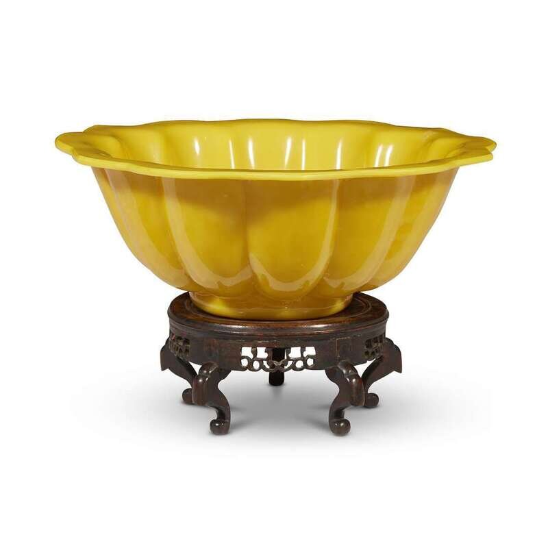 A large Chinese molded opaque yellow glass twelve-lobed bowl