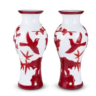 A pair of Chinese ruby-overlaid white "Peking" glass "Bird and Flowering Branches" vases