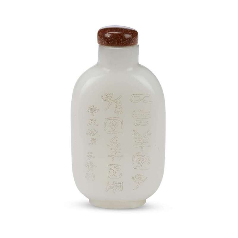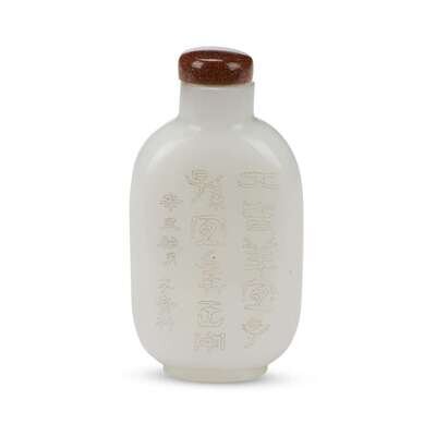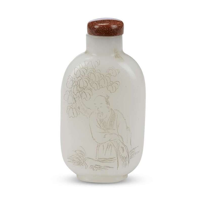 A Chinese white glass snuff bottle, finely incised with a scholar under a tree and calligraphic script