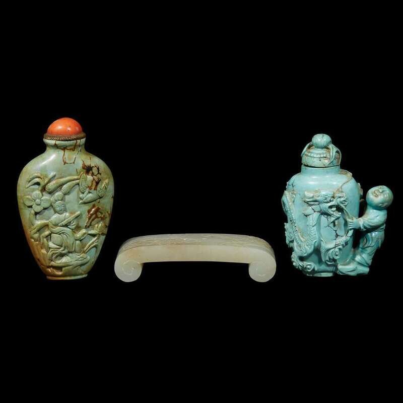 A Chinese turquoise "Boy and Dragon" snuff bottle and a celadon jade incised "Bats" stand