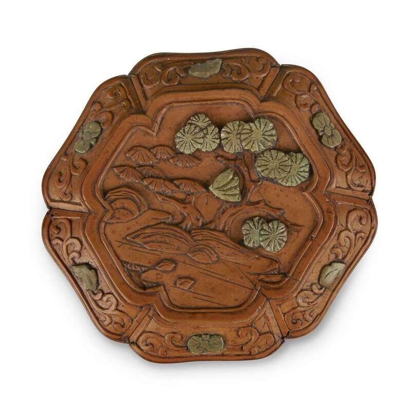 The cover carved with a pine tree, the needles of turquoise within a raised, lobed border, the shoulders carved with foliate sprays, the sides carved with a continuous landscape in reserves, raised on conforming base.